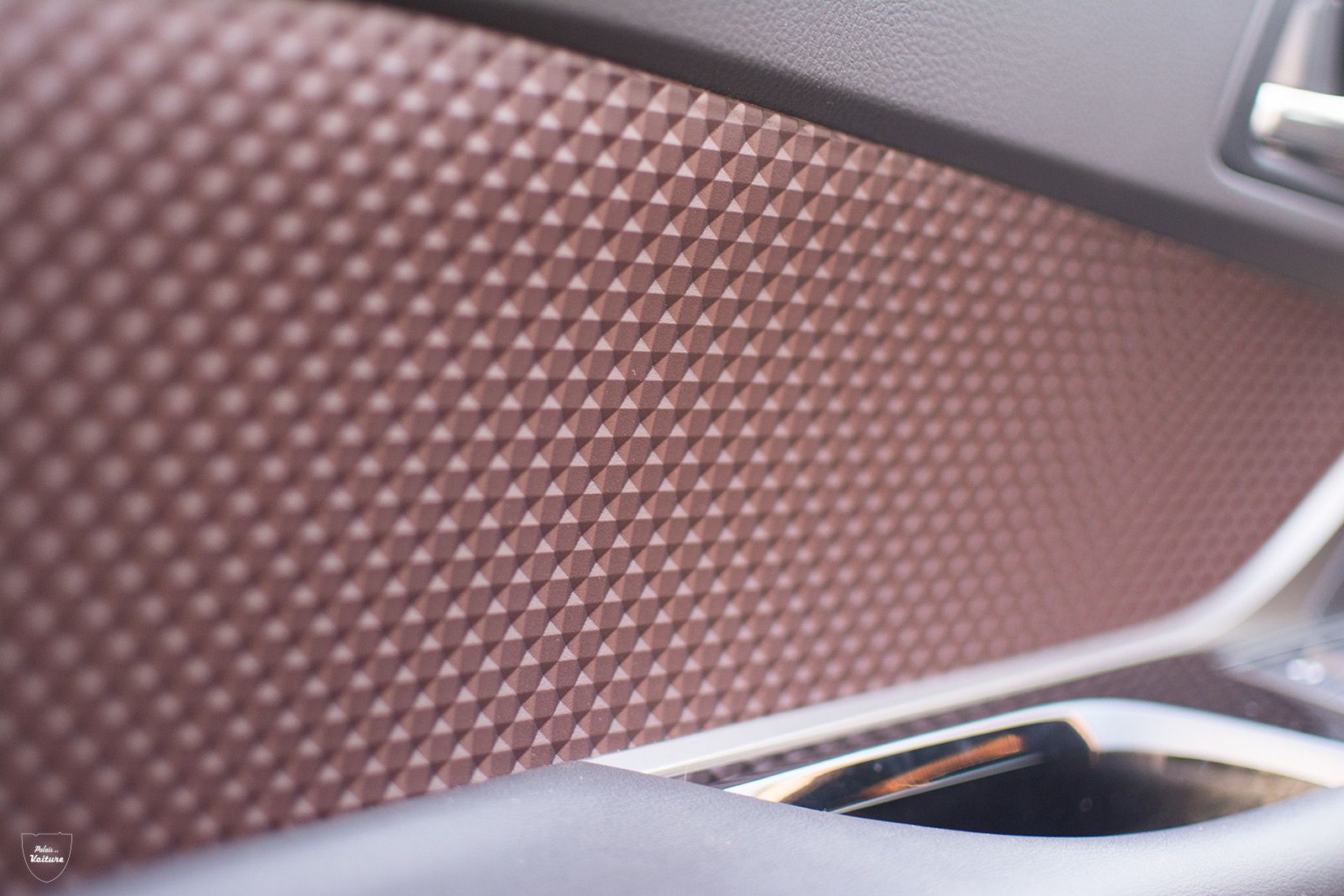 La planche de bord arbore un habillage en cuir surpiqué de couleur. Dans le cas de notre exemplaire, c'est la teinte chocolat qui a été choisie. On la retrouve notamment sur les habillages de portières, avec une texture plus flatteuse à l'œil qu'au toucher. On retrouve aussi des motifs sur le toit, à l'intérieur, du plus bel effet.